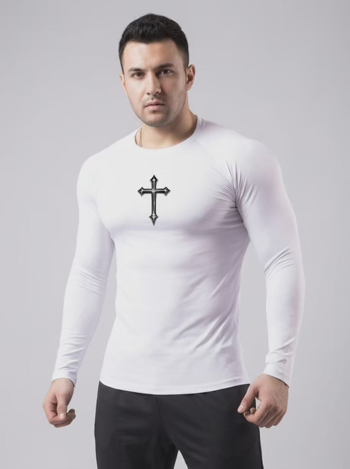 If you want a faith-forward training top that performs and also streamlines your look, this cross print compression shirt delivers—short sleeve or long sleeve, your call.