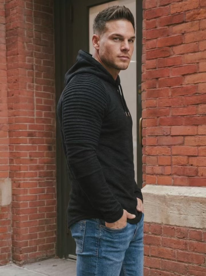 Men’s pullover hoodie with raglan sleeves, drawstring hood, long sleeves, ribbed sleeve detail, and a curved hem. Hooded sweatshirt with a clean fitted look and comfortable everyday wear.