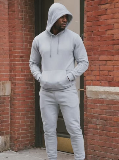 Men’s hoodie and jogger set with a pullover hooded sweatshirt, kangaroo pocket, and matching drawstring sweatpants. Two-piece tracksuit set designed for everyday wear with a comfortable fit and clean solid color look.
