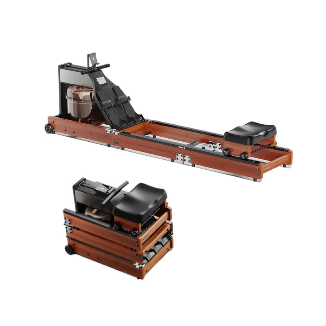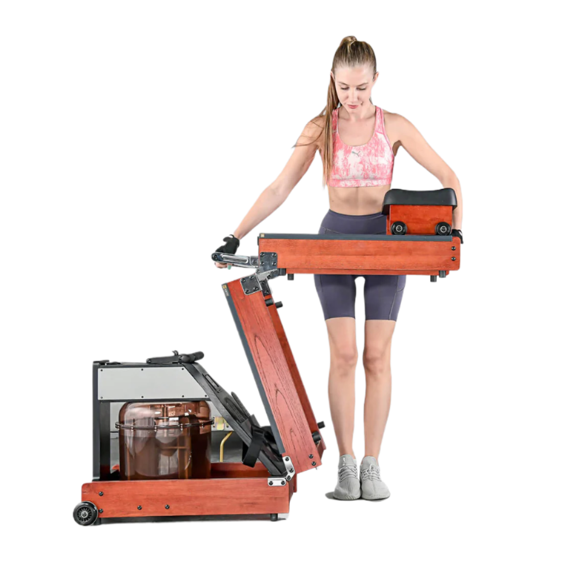 - Foldable Rower Machine 180°foldable new storage design save home space, with the natural beautiful oak texture looks it like a beautiful piece of furniture. folded size: 21.3*17.5*35.8"/54*44.5*91cm. With patented sealing technology, no need to drain after use and no water leakage when stored upright.